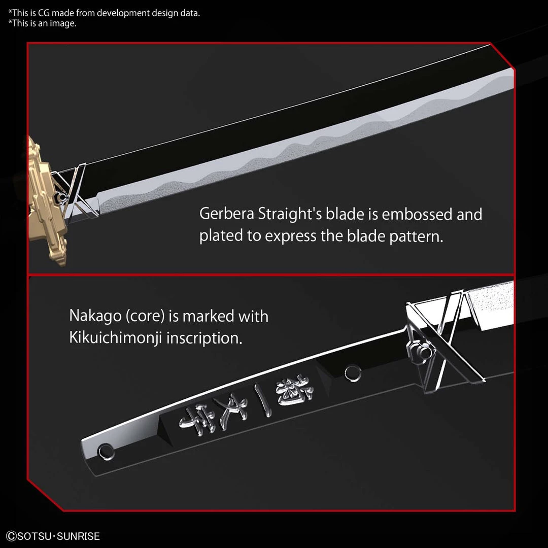A pre-assembled frame using die-cast has been adopted. The color division of the pre-assembled hand parts have been recreated. Certain sections of the frame have also adopted muscle-like forms, and other sections have emboss processing applied to create texture. The Gerbera straight has had emboss processing and plating applied to recreate the tempered patterns. The armor on the upper arm slides as the arm moves. The pre-painted and pre-assembled frame was created using die-cast, recreating an intricate texture and heft. The armor on the shoulder blades is linked to the movements of the arms. Different open hand pareds are included for left and right hands. The layered structures of the frame and armor create dense movements. Details that resemble the shape of muscles have also been recreated. The big toes on each foot are divided for articulation to recreate poses where the kit is stepping in. Certain sections have had emboss processing applied, creating surface textures that give density to its design.