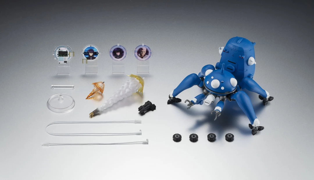 From Tamashii Nations. As seen in Ghost In The Shell S.A.C. 2nd GIG & SAC_2045 comes the dependable Tachikoma! Faithfully replicating the character’s on-screen appearance, this figure incorporates natural posability and abundant accessories to allow you to re-create your favorite scenes from the series. Includes optional extensible hands and independently posable eyes. Also includes an Optional Gatling unit, Four optional tires, Muzzle flash effect, Grenade effect, Wire (long), Wire (short), Four cyber communication screens, and an Effect part stand.