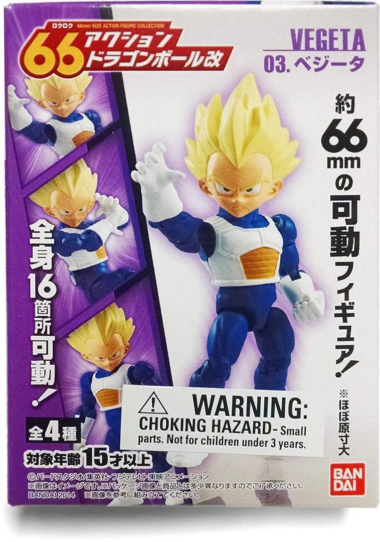 Action 66 Vegeta. The Bandai Shokugan 66 Action series combines mobility and high quality molding to create a great series of DragonBall figures. Each “66 Action” figure stands about 66mm tall (2.6″). NOTE: Due to the unique design of each character, the actual size of the figure may be slightly smaller or bigger. Each figure has up to 16 points of articulations, and is capable of a wide range of motion. In addition, every “66 Action” figure comes with interchangeable hand parts.