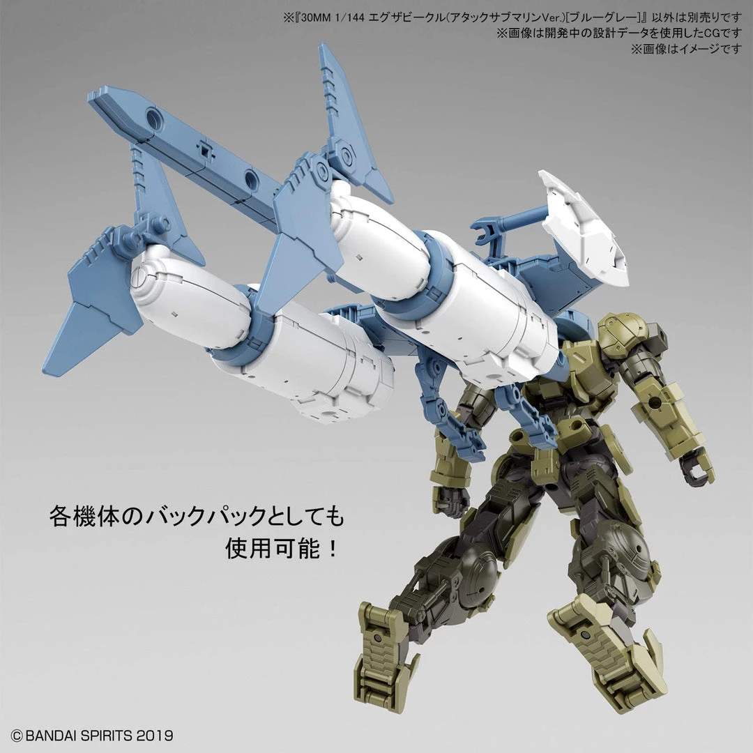 Attack Submarine Ver. is now available in the 30MM “Extended Armament Vehicle Series” that expands the range of customization options available! By changing the parts, it can be transformed into 3 types: ray type, saw shark type, hammerhead shark type. Can be used as a backpack for 30MM mecha or other similar sized model kits. Can be used as a customized part if disassembled. Vehicle x1 Face parts x1. The product box will have a Bluefin / Bandai Namco warning label, which is proof that you are purchasing an officially licensed Bandai product, distributed by its sole and authorized distributor (Bluefin ) for the U.S. Markets. This product has been thoroughly tested for safety and meets all North American consumer product safety regulations. The affixed label also entitles the purchaser to product support assistance within the United States.