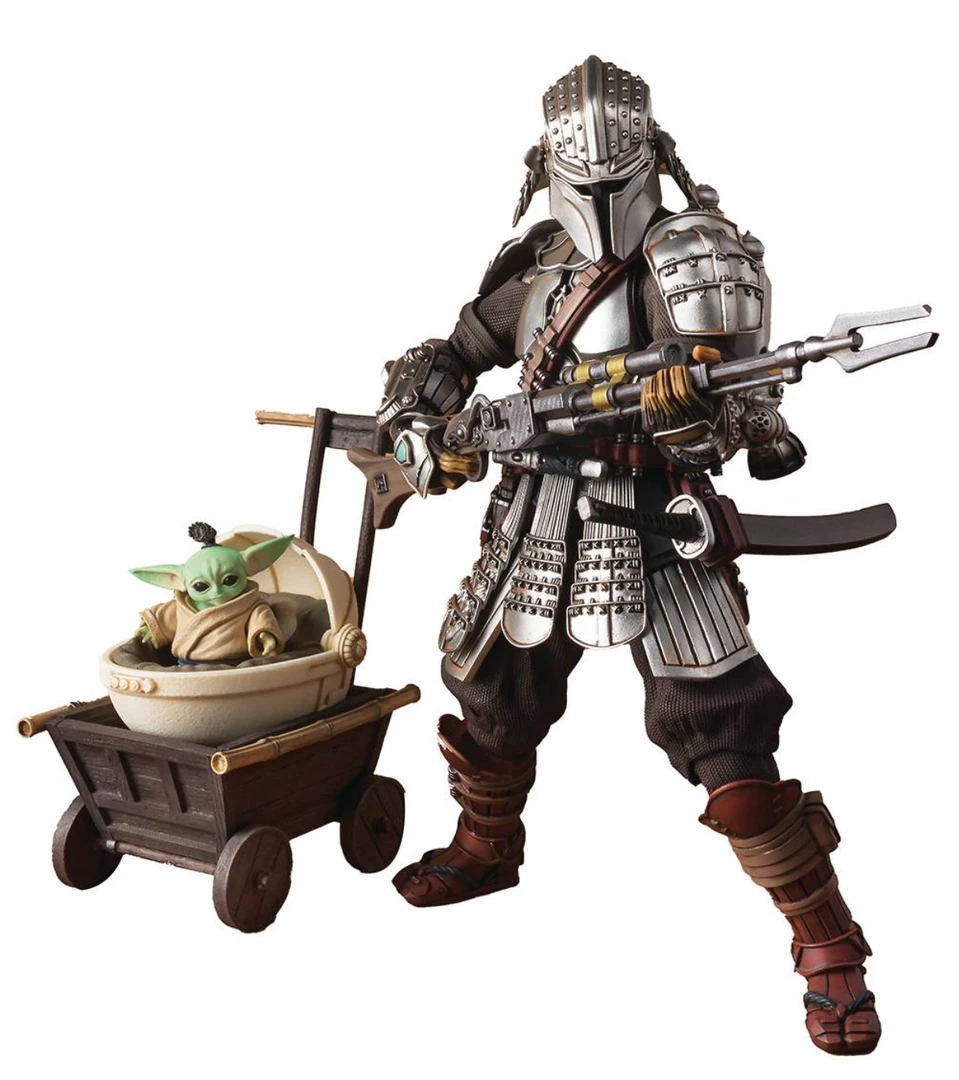 From Tamashii Nations. The Mandalorian returns to the Meisho Movie Realization series with a completely new sculpt suit and armor inspired by the beskar armor from the Disney+ Series! Included with this figure is an in-scale figure of Grogu who can be seated in a pram inspired by wooden pushcarts from the Samurai era of Japanese history. The Mandalorian rifle and blaster are included as is his jetpack.