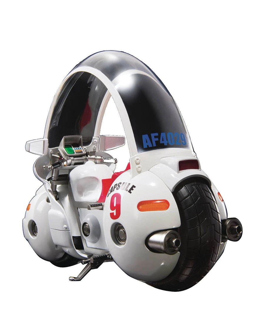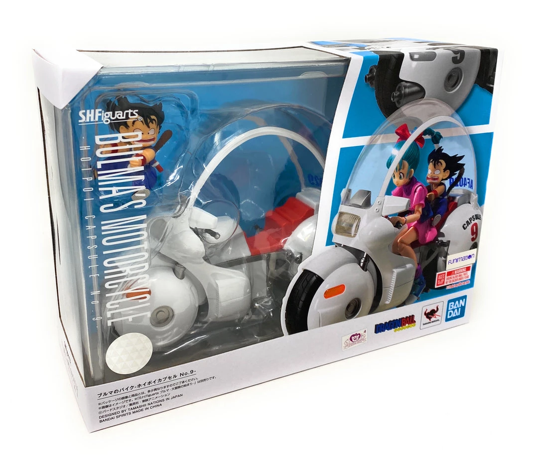 From Tamashii Nations. From the first episode of Dragon Ball, the bike Bulma rides joins S.H.Figuarts! The roof panel, turn signal, and headlamp are molded in translucent plastic. The frame, front fork, muffler, and footrests are all made of diecast metal, giving the bike a satisfying sense of weight. It even comes with a display stand featuring the Capsule Corp. logo. It also includes an in-scale kid Goku. Plus, the stand lets you pose the bike statically, as if riding, or popping a wheelie!
