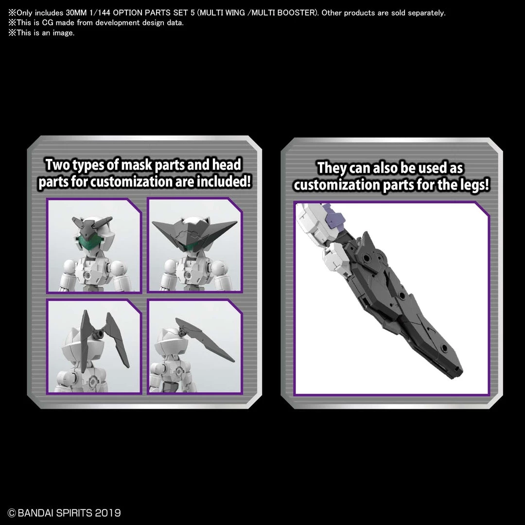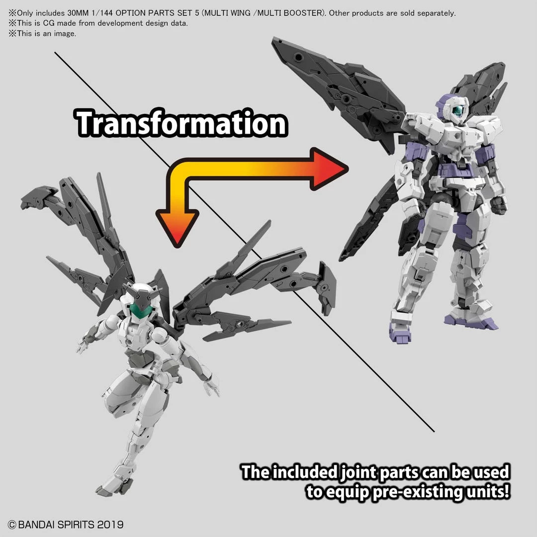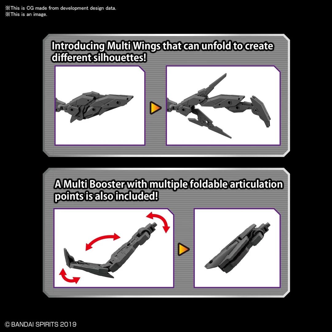 From Bandai Hobby. This 30MM (30 Minutes missions) accessory set includes a multi-wing that changes its appearance when it’s deployed! Attach it to your 30MM figures (sold separately) with the included joint parts; the multi-wing can also be used as a custom part for the legs. A multi-booster that can be folded is also included, as are two types of custom mask and head parts.tyle models.