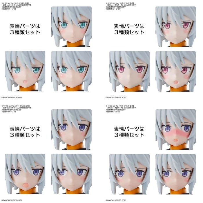 From Bandai Hobby. Change your 30MS (30 Minutes Sisters) figure model kit’s face and personality with this face parts set! There are four different sets available, and each set contains three different facial expressions (for a total of 12 expressions).The features are tampo printed. Order yours today!