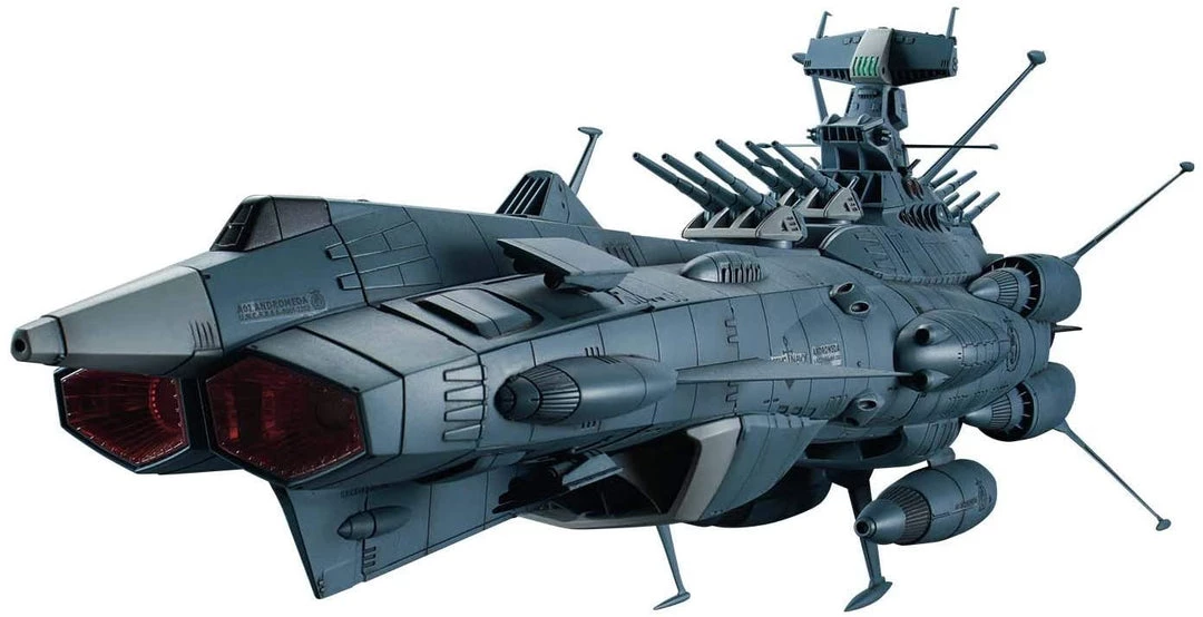 From the series, “Space Battleship Yamato 2202” (Star Blazers) comes the 1/1000 Andromeda class ship product which allows you to build 2 versions of the Andromeda. Can choose between the Andromeda and its upgraded parts after being damaged or its sister carrier Type ship the Antares. Includes quadruple-mount wave motion gun parts, 2 Cosmo Falcons, 4 Cosmo tigers, and display stand. Runner x 19, stickers, water slides, instruction manual.