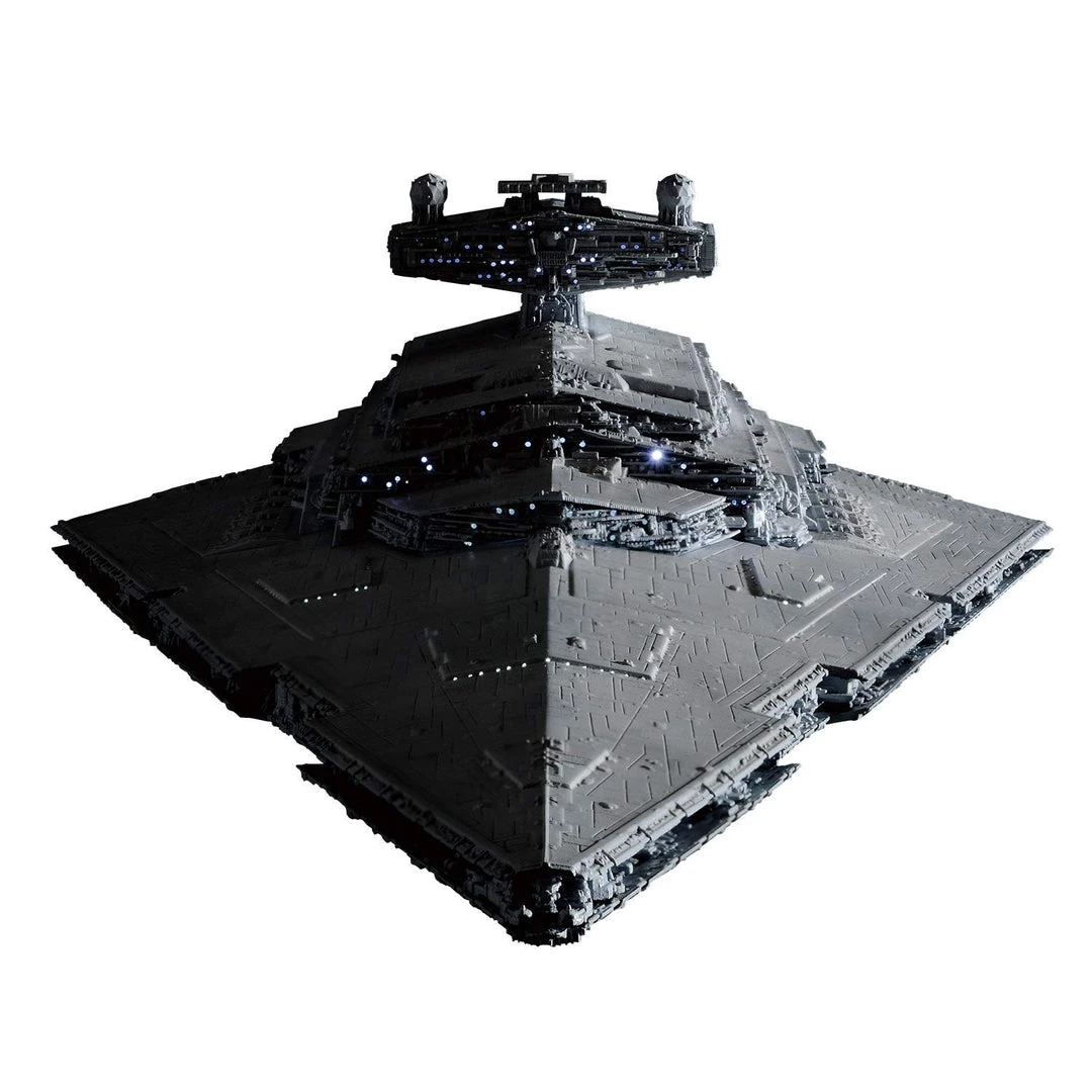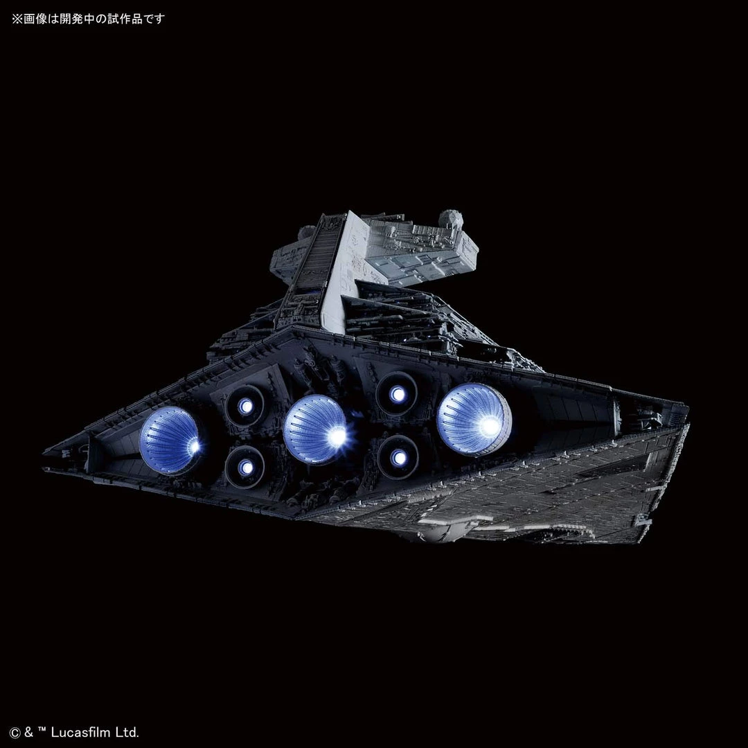 From Bandai Hobby. The long awaited Star Destroyer from Star Wars is here as a 1/5000 model kit! This 12.6 inch long model comes with a display stand, in-scale Millennium Falcon, and a Blockade Runner to recreate the sequences in Star Wars: A New Hope. In addition to the LED unit that will light up the engines and areas around the body, this version has first edition bonuses including exclusive box art, clear parts, and a special guide booklet for this Limited Edition that will not be available on future re-issues of the Lighting Model version.  Runner x 10, sticker, LED unit, Lighting Model special manual, special booklet.