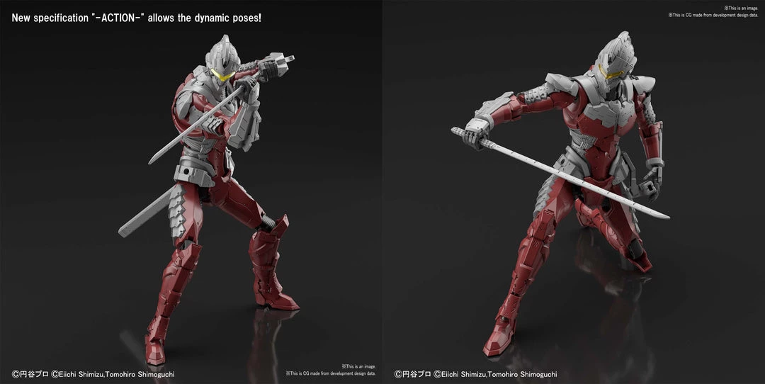 From Bandai Hobby. The new ACTION version of Ultraman focuses on recreating the incredible dynamic poses by characters in the Ultraman series. New molding in the chest and neck allow a great range of motion and incredible sword poses. Includes Specium Sword, scabbard, eye slugger weapons, and interchangeable hands.