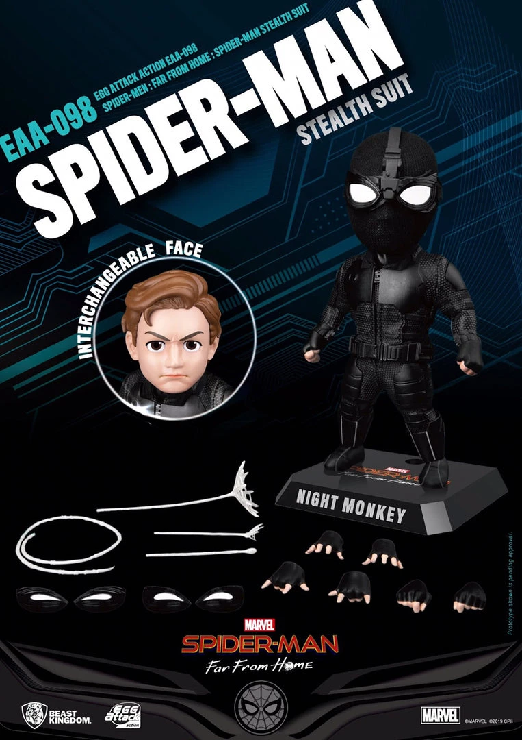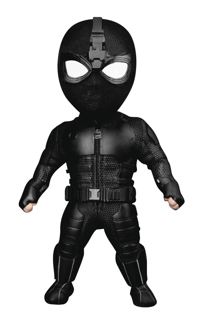 From Beast Kingdom. A PREVIEWS Exclusive! Emerging from the shadows to protect his dearest friends, Spider-Man is ready to save the day once again! Straight out of Spider-Man: Far From Home, Spidey’s tactical styled stealth suit is brought to life in this 6-inch EA-098 Spider-Man Stealth PREVIEWS Exclusive action figure! Featuring 26 points of articulation, the stealth suit is made from real cloth with PVC tactical details, Spidey’s mask comes with alternate eyes for a variety of expressions! Along with multiple sets of hands and web shooting effects, this figure also comes with an unmasked head featuring a likeness of actor Tom Holland!