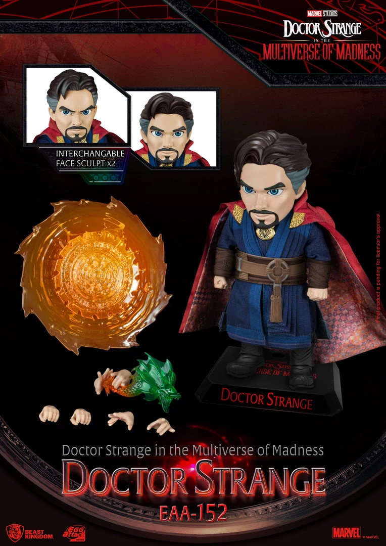 From Beast Kingdom. The EAA series of 6-inch action figures launches the latest set from Doctor Strange in the Multiverse of Madness! The EAA-152 action figure is a new design showcasing the sorcerer himself wearing his latest outfit. Made of real fabric, the detailed suit and cape is highly detailed down to the added accessories and magical cloak. Included is a collection of magical effects and  portals, two head sculpts reproducing the Doctor’s otherworldly and mysterious abilities, and a special, branded base with logo. An unmissable action figure set for fans of the new movie!