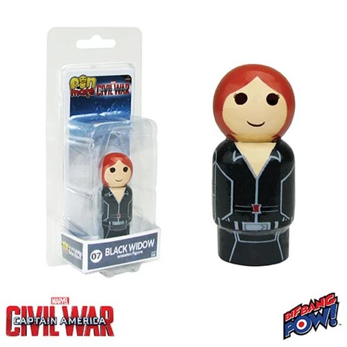 The Black Widow is ready to take on her next mission as the first-ever Captain America: Civil War Black Widow Pin Mate from Bif Bang Pow!. Designed in a retro-style, this Black Widow miniature wooden figure highlights her movie-inspired suit with detailed 360-degree artwork that includes hand-painted details alongside limited decal graphics.