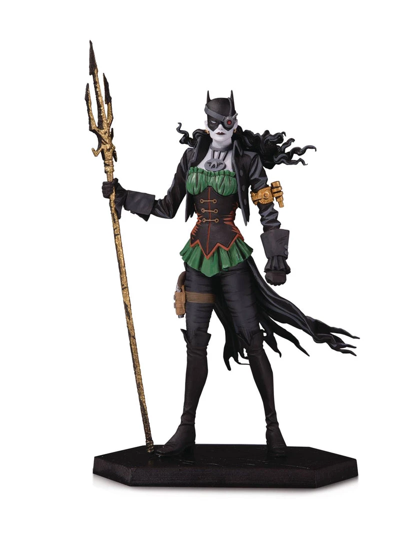 Rocking into our world from the pages of DARK NIGHTS: METAL comes a nightmarish fusion of a gender-flipped Batman and Aquaman-the Drowned. Bryce Wayne came from Earth-11 and harbored a deep hatred of the Atlanteans for their role in the death of her beloved, Sylvester Kyle. In a quest to avenge Kyle, she spliced her DNA with that of Atlanteans, becoming a super-powered Dark Knight capable of breathing and fighting underwater. This carefully detailed statue highlights the unique character design of this mashup, as the Drowned has her own trident and cape, and sports the flowing hair of a submerged and vengeful Dark Knight.