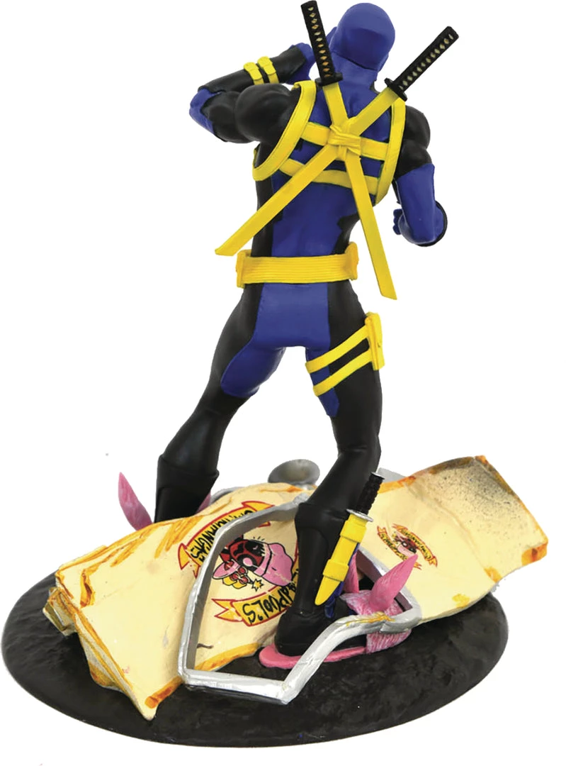 A Diamond Select Toys release! Deadpool returns to the Marvel Gallery line in style! Unfortunately, his ride got trashed along the way, and Deadpool is posed atop a destroyed taco truck base, sporting bunny slippers and wielding twin finger guns with the safeties off! This all-new sculpt spotlighting the softer side of Deadpool stands approximately 10 inches tall and is made of high-quality PVC with collectible-quality paint applications, and this Showcase-exclusive variant depicts him in his blue-and-yellow X-Men colors! Packaged in a full-color window box, it’s limited to only 1200 pieces. Designed by Caesar, sculpted by Cortes Studios!