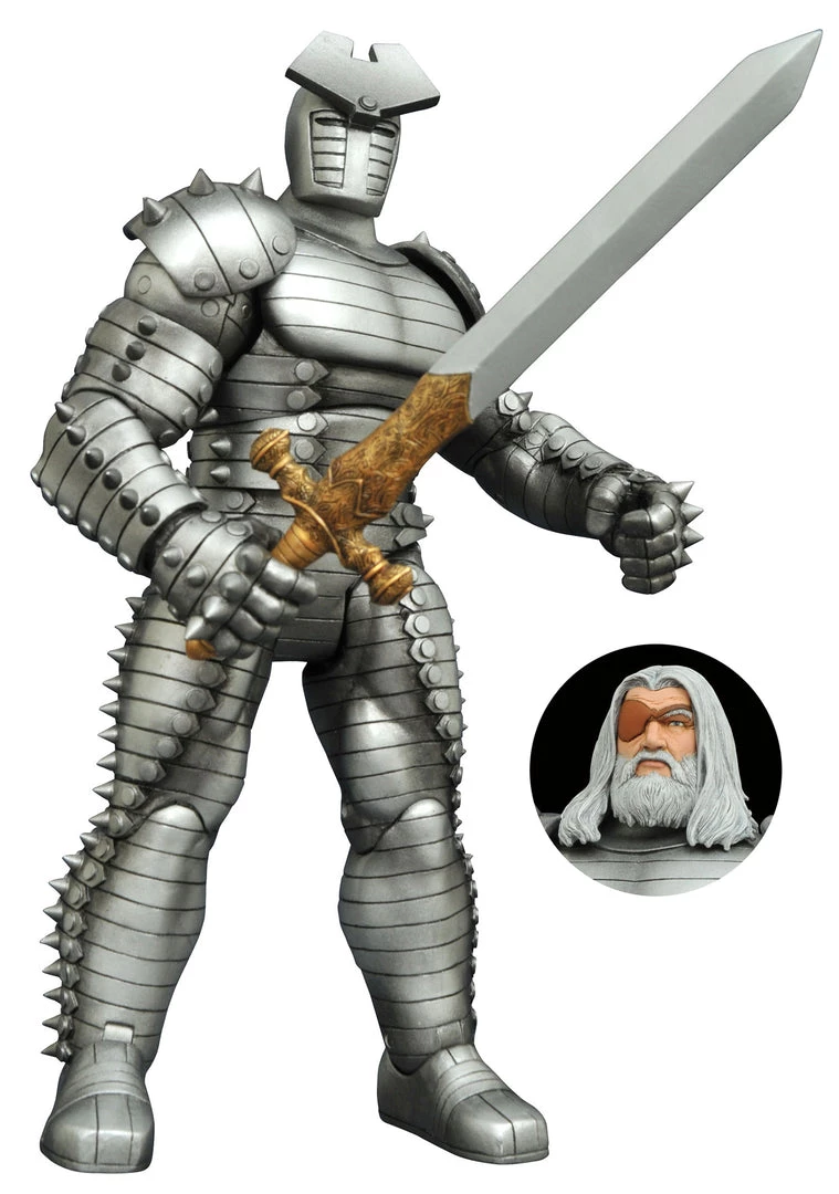 A Diamond Select Toys Release! Prepare to be destroyed! The next 7-inch-scale Marvel Select action figure is the Destroyer, the massive Asgardian automaton that regularly menaces the Mighty Thor! Measuring approximately 9 inches tall with 16 points of articulation, this spiked powerhouse comes with the powerful Odinsword, as well as an interchangeable head, revealing the one-eyed face of the All-Father, Odin, from the times he has worn the armor in battle! Whether you choose to display him as the Destroyer or as Odin, he’s more than a match for your Marvel Select Thor, or Hulk, or even Juggernaut! Packaged in the display-ready Select packaging, with spine artwork for shelf reference. Sculpted by Jean St. Jean!