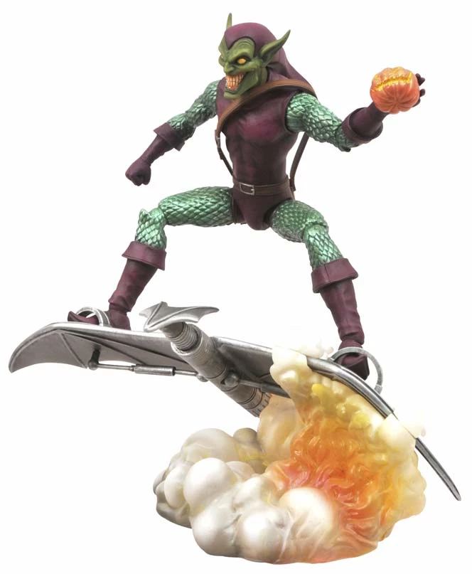 A Diamond Select Release! Designed and Sculpted by Art Asylum! Marvel Select gives their take on one of the Marvel Universe’s most popular villains! Spider-Man’s longtime nemesis, Norman Osborne, has never looked more menacing, wearing a detailed, modernized sculpt of the classic Green Goblin costume. Equipped with Marvel Select’s standard 16 points of articulation, this 7″ H figure can perch on top of his included base, a perfectly balanced Goblin Glider wrapped in smoke. The Green Goblin comes in oversized collector packaging, ready for display.