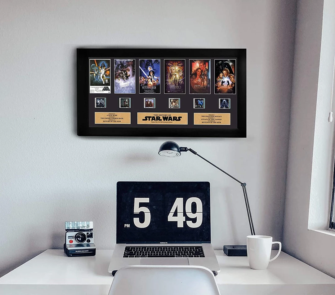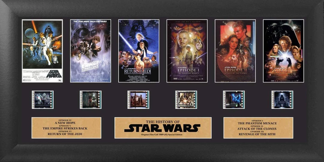 The first six Star Wars films are immortalized in this FilmCells presentation. This framed collectible features the film posters of the first six films, a certificate of authenticity, and six clips of real 35mm film from the Star Wars saga. Each officially licensed FilmCells presentation is made with careful attention to detail. It is double matted, placed in a quality frame, and contains an acrylic front and back allows natural light to enhance the film frames. This is all put together to bring you a collectible that looks great in any room. Each piece of film is hand-cut from reels to provide you with the best possible scenes to offer a unique and varied product. The film strip portrayed in the image above is only an example of the film cells you may receive. Please note, the cells may vary from piece to piece as they are hand selected from reels of film.