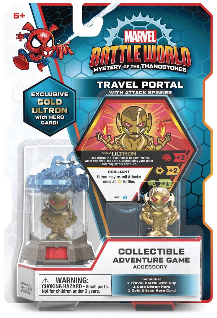 From Funko. Pick your favorite Hero, rescue your friends, and win battles to defeat Thanos! Use this Marvel Battleworld accessory to carry your favorite Hero anywhere, just clip the Travel Portal to your bag. Plus you can use the easy-swipe spinner instead of an Attack Dice during gameplay – great for playing while on-the-go! Comes with an exclusive Gold Ultron Hero that is only available with the Travel Portal!