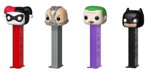 Set of 4. Pay tasty homage to your favorite DC superheroes and villains with Pop! PEZ Harley Quinn, Bane from The Dark Knight Rises, the Joker from Suicide Squad and Batman from The Dark Knight.