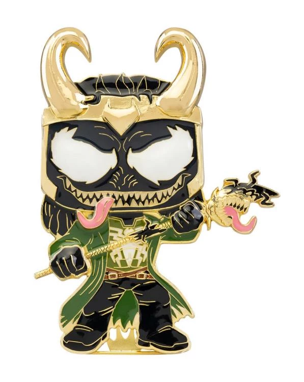 Loki is host to Venom, and the duo is ready to tear through your Marvel Venom collection. This Venomized Loki Pop! Pin features: gold hardware, a built-in stand, a 3D molded metal helmet and scepter, and Venom Loki’s white eyes that glow in the dark. Enamel pin is approximately 4.15-inches tall.