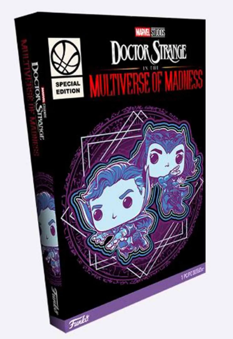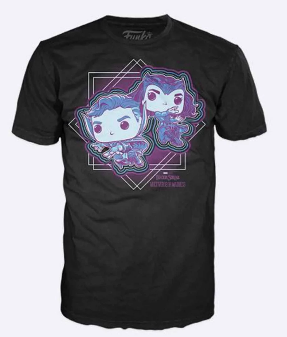 Doctor Strange joins the Funko Pop! T-shirt line! This tee comes packaged in a special box featuring Pop! Wanda and Doctor Strange in the Multiverse!Â
