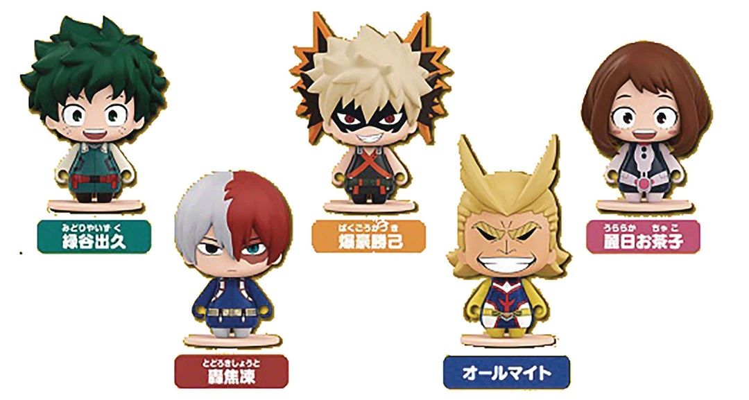 From Takara Tomy. Pocket-sized mini figures from My Hero Academia are here! From the popular anime series My Hero Academia comes a set of Pocket Maquette collectible figures! The line-up includes Izuku Midoriya, Katsuki Bakugo, Ochaco Uraraka, Shoto Todoroki and All Might for a total of five different varieties! They an be displayed either standing or sitting.