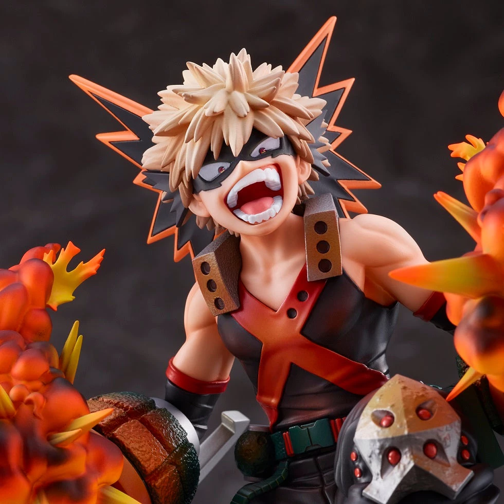 From Takara Tomy, Katsuki Bakugo Explosion 1/8 scale figure. The Figure Stands Eight inches tall. The Dynamic pose faithfully recreates Katsuki’s maniacal pose feature his explosion in mid-action.