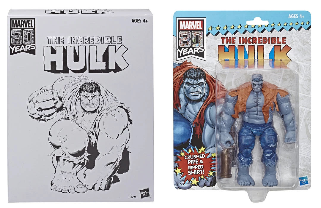 From Hasbro Toy Group. Fans can celebrate the Marvel Universe with this Exclusive Incredible Hulk figure from the Marvel Legends Series. Standing 8.5 inches tall, this high quality, realistic figure with multiple points of articulation includes the classic grey character design of the muscle-bound behemoth that first officially appeared in The Incredible Hulk #1 in May 1962. Includes crushed pipe weapon accessory and ripped shirt accessory, which can be removed.