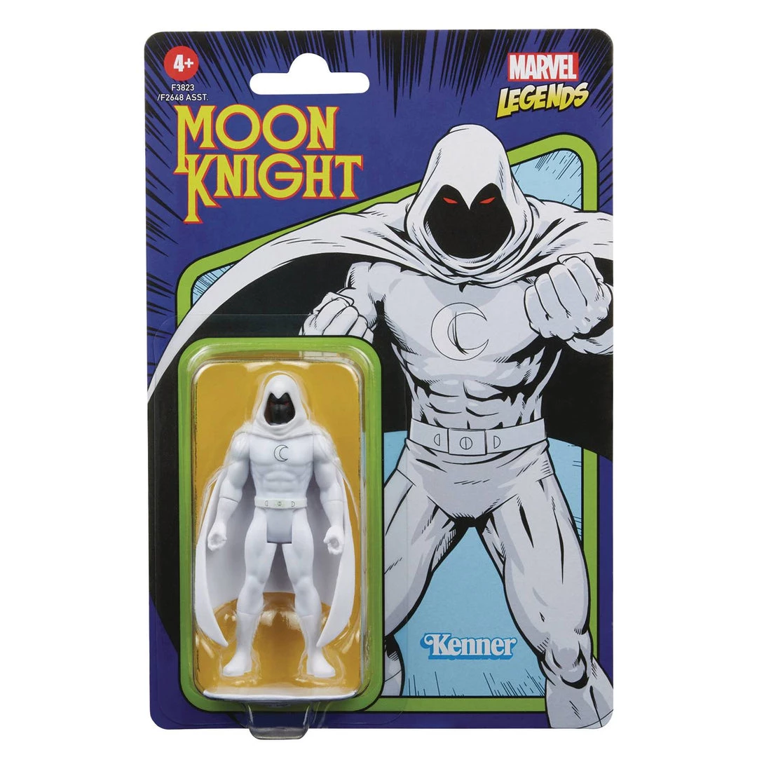 From Hasbro Toy Group. Fans, collectors, and kids alike can enjoy this 3.75-inch-scale classic Retro 375 Collection Moon Knight figure, inspired by the character from Marvel comics! Each  Retro 375 Collection figure has premium design, detail, and articulation and come packaged in a 70’s inspired illustrated backing card.