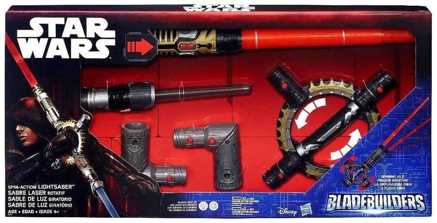 The Bladebuilders Spin-Action Lightsaber lets you become a true hero of the dark side with an included Lightsaber, lightdagger, and a unique spinning accessory! Combine the Bladebuilders Spin-Action Lightsaber with other lightsabers in the Bladebuilders collection and imagine the thrill of battle for the dark side!