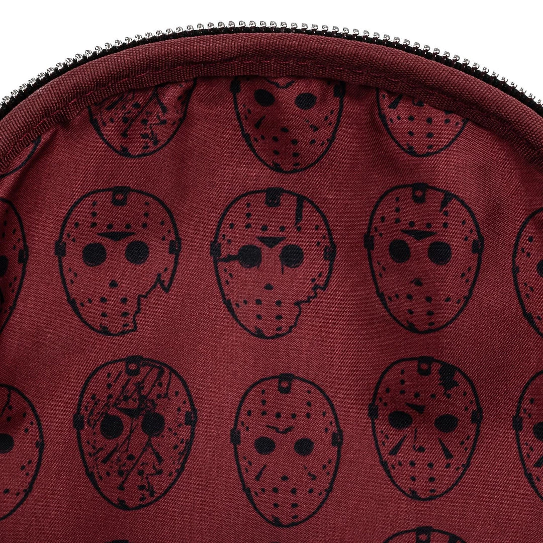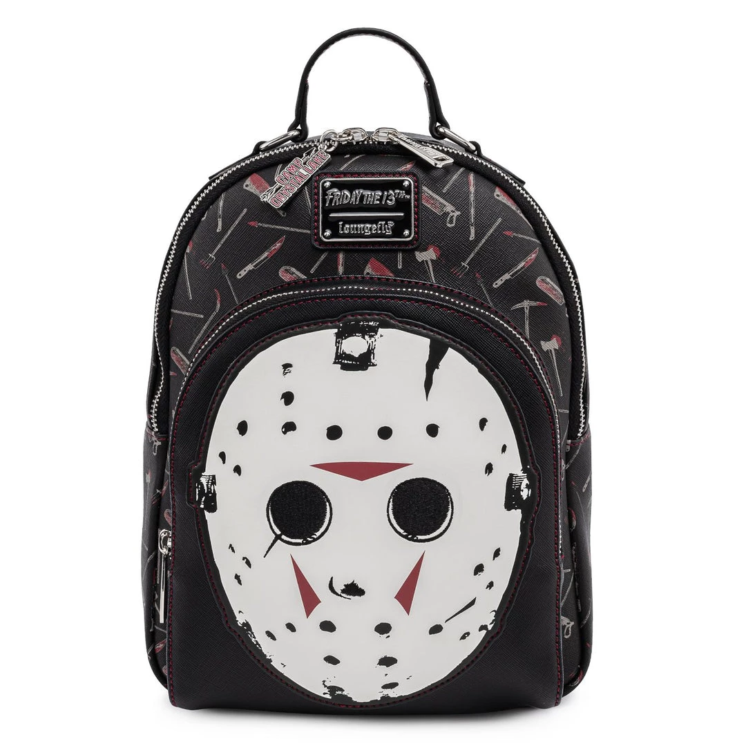 No need to wait for Friday the 13th! The Loungefly Friday the 13th Jason Mask Mini Backpack is here to put the fear in your collection. The background pattern features an assortment of weapons. On the front and center is Jason’s hockey mask which glows in the dark. It’s a striking design making it an appealing accessory for Halloween-themed outfits.