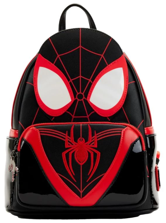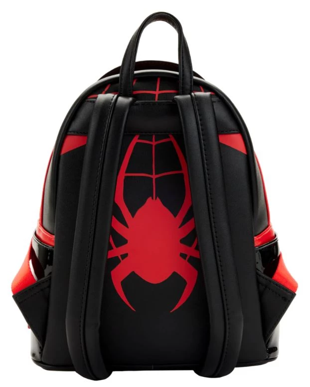 Be the hero of your neighborhood and beyond! The Loungefly Spider-Man Miles Morales Cosplay Mini Backpack resembles Miles Morales’ suit from Spider-Man: Across the Spider-Verse (Part One). The front zipper pocket features the chest markings shown on Miles’ black and red Spider-Man suit. Up above, pearlescent eye markings give shape to his iconic mask. An enamel zipper pull shows Miles as he is about to sling a web from his hand. On the back, the infamous spider emblem makes an encore appearance. This mini backpack has plenty of room to keep your crime fighting essentials safe as you swing through your day.