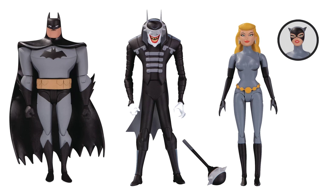 From TMP/McFarlane’s Toys. Inspired by the beloved and Emmy Award-winning Batman: The Animated Series, The Adventures Continue Batman Who Laughs features a design in the iconic Bruce Timm art style. Set includes Batman, Batman who laughs, and Catwoman.