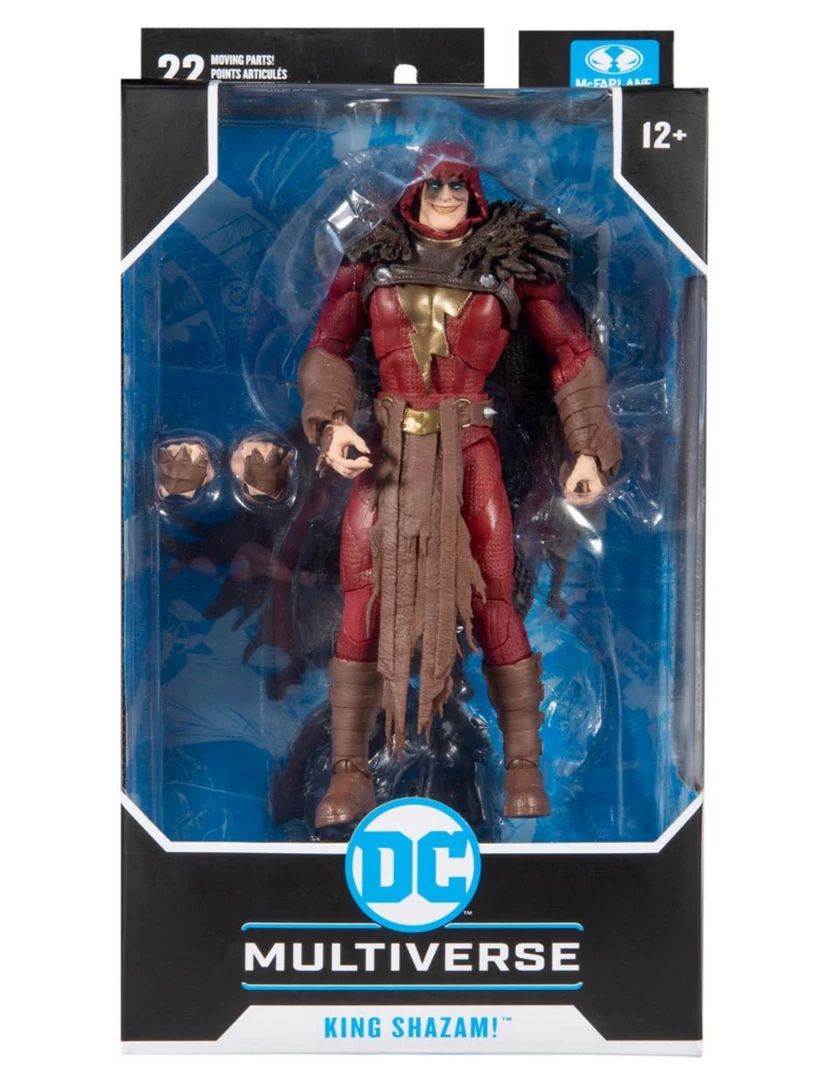The DC Multiverse King Shazam! 7-Inch Scale Action Figure comes packaged in a blister box and comes with a collectable art card that features comic artwork on the front, and character biography on the back. Based on the character in theย Dark Nights: Heavy Metalย comic book. King Shazam! is designed with ultra articulation with up to 22 moving parts for full range of posing and play. King Shazam! includes alternate hands and a display base.