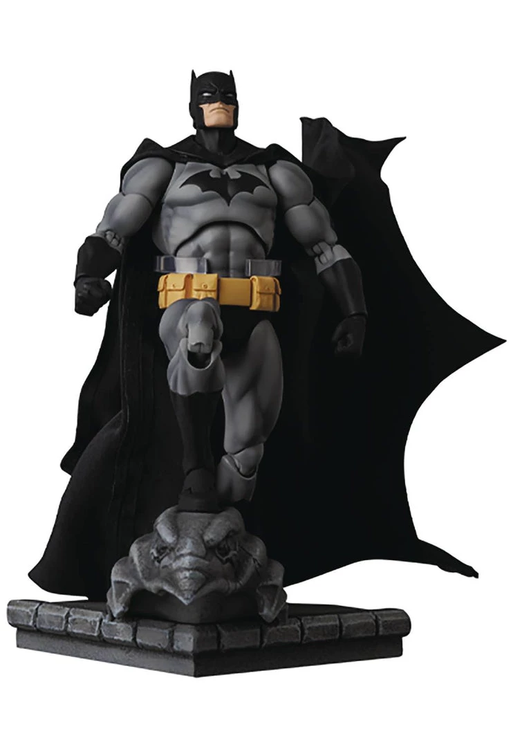From Medicom Toy. Based on the best-selling series Batman: Hush by Jeph Loeb and Jim Lee, Medicom unveils their newest release in their new DC Comics MAFEX line of 6″ articulated figures! Featuring a high level of articulation, this black version of Batman is sculpted from original designs by Jim Lee! Batman features a poseable cloth cape, multiple exchangeable hands, and three different head designs including an unmasked version! Batman also includes a movable figure stand to easily reproduce any scene from the comic!