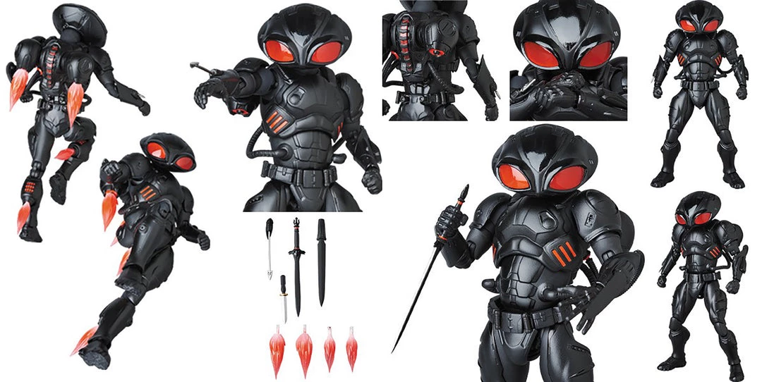 From Medicom Toy. From the movie Aquaman comes this MAFEX figure of Black Manta! The figure stands around 6.3″ tall and includes interchangeable hands, jet pack blast effects, sword, knife, removable blade and a spear attachments for the wrist gauntlets! Inculdes movable figure stand.Â