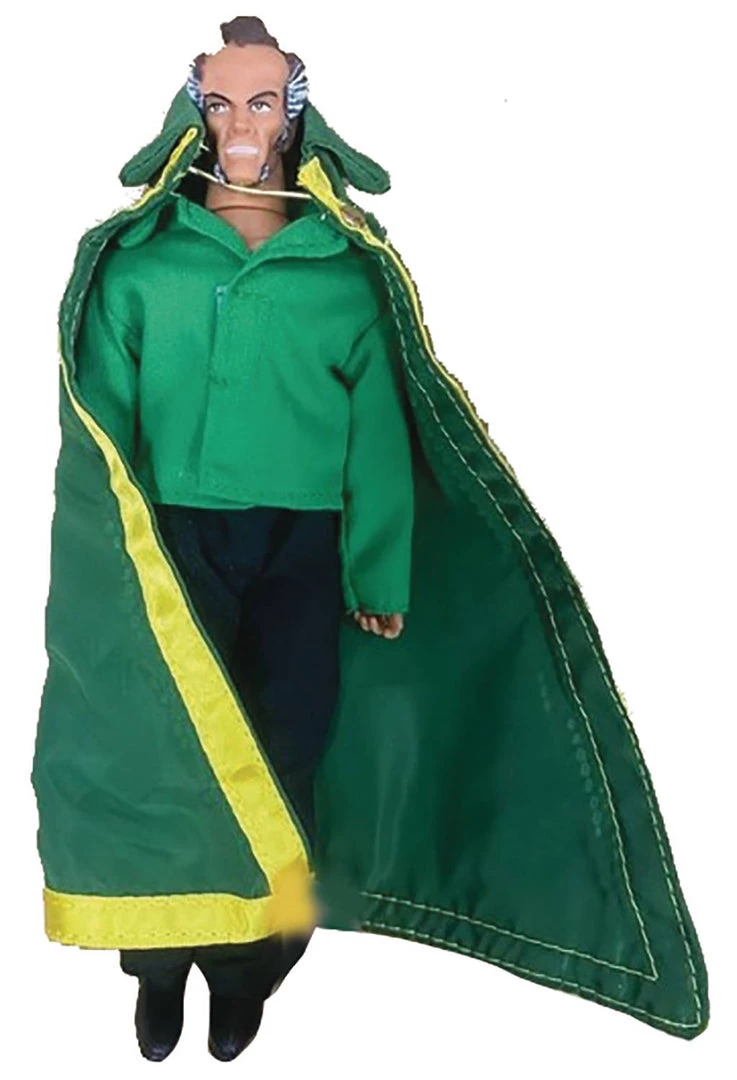 From Mego. Officially licensed and fully poseable, these dress-able figures feature 14 points of articulation and highly detailed fabric outfits! Standing about 8″ tall, this New 52 Ras Al Ghul figure comes dressed in his green shirt, black pants, and cloak, and comes packaged with character specific accessories in a retro style blister card.