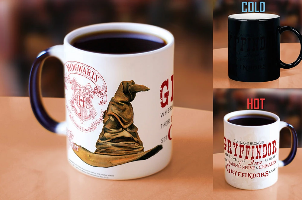 Pledge your allegiance to Gryffindor with this Morphing Mugsâ„¢ heat-sensitive, color changing mug featuring the words of the house, an image of the Sorting Hat and the Hogwartsâ„¢ sigil. The exterior of this 11oz mug transforms from black as hot liquid is added, revealing the hidden image in full vivid colors.