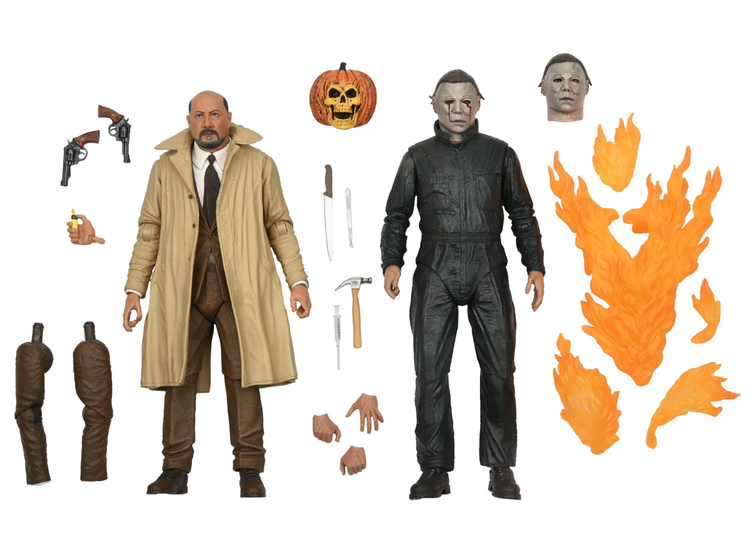 From NECA. Celebrating the 40th anniversary of the classic 1981 sequel Halloween 2, this action figure 2-pack includes 7-inch-scale versions of Michael Myers and Dr. Loomis! Both feature digital facial printing for extra accuracy. Dr. Loomis has removable arms so he can be displayed with or without his trench coat. Recreate the fire scene with attachable fire effects for Michael! It’s packed with more accessories too, including interchangeable hands, lighter hand for Dr. Loomis, 2 handguns, pumpkin, extra arms for Dr. Loomis, hammer, syringe, knife, scalpel, fire effect, and an extra “bloody tears” head for Myers.