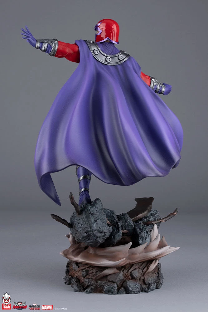 From PCS Collectibles. The Magneto 1/6 Scale Diorama is fully sculpted to capture the might of this iconic mutant, based on his in-game model. His signature red and purple costume features varied textures and piping as well as silver accents underscoring his powerful physique. Magneto’s portrait has white eyes that emphasize his abilities in action, and he wears his glossy red helmet to withstand any psychic influence from his enemies. As he wields his magnetic abilities, his sculpted purple cape flows dramatically behind him, giving a sense of action and movement to this dynamic X-Men statue.