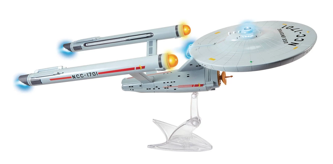 From Playmates. This replica ship series begins with perhaps the most well recognized ship in the Star Trek Universe: the original U.S.S. Entrerprise! This detailed 18″ replica ship is accessorized with a sleek display base and features sound effects, phrases and light up effects drawn directly from the Original Series. The Enterprise includes a poseable display stand and comes in Try Me Retro Packaging that recreates the original 90s Playmates package.