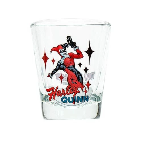 DC Comics’ sometimes girlfriend of The Joker is now on a shot glass! This beautiful, heavy-duty Batman Harley Quinn DC Comics Shot Glass features Harley Quinn with her pop gun! PopFun’s expanding line of mini glasses features large images, brilliant colors, and more of your favorite comic and cartoon characters than any other line of glassware. Measures about 2 1/2-inches tall and holds up to 1 ounce of liquid. Hand wash only. Not dishwasher safe. Do not microwave.