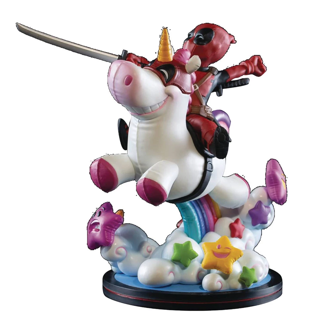 From Quantum Mechanix. If Deadpool loves anything more than chimichangas and cracking wise, it’s unicorns. He really loves unicorns. Probably a little too much, truth be told. And now he can ride his very own majestic steed in the Deadpool x Unicorn Q-Fig Max Elite! From the vibrant rainbows to the whimsical inflatable stars, this piece positively screams Deadpool. With Mr. Pool riding his buoyant and uni-horned steed, this Q-Fig Max Elite is huge. Measures about 6″ tall.