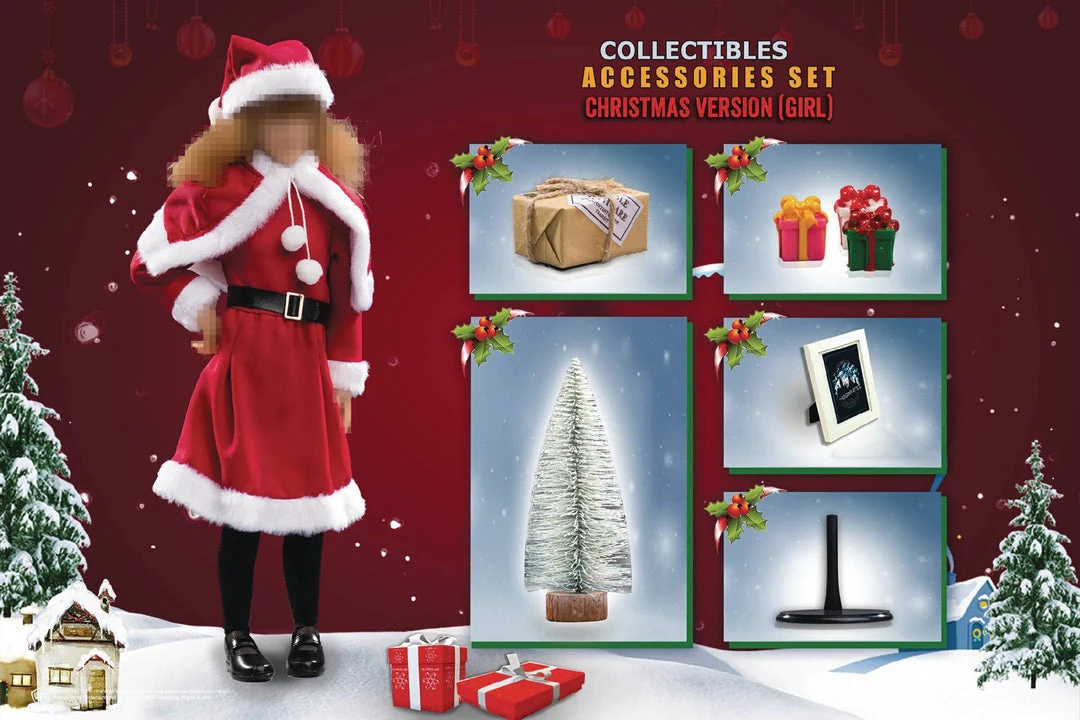 From Star Ace Toys. Celebrate the Christmas season at Hogwarts with this set of accessories! The Christmas Set accessories (Girls) Sixth Scale Collectible Figure features: One Christmas hat, Red Santa coat,Β Β Red Santa dress, Black Belt, pair of black shoes, Bag of Christmas treats, Christmas tree, Hogwarts parcel, Three small gifts with snow effects, Photo frame with Hogwarts images, and a Christmas Card!
