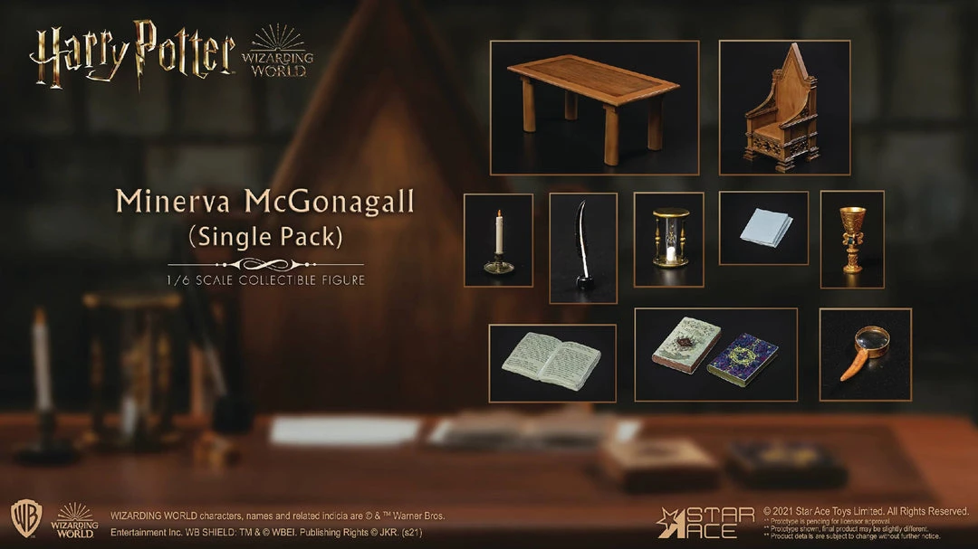From Star Ace Toys.Ā The first teacherĀ Harry PotterĀ sees inĀ Harry Potter and the Sorcerer’s StoneĀ is transfiguration professorĀ Minerva McGonagall!Ā This set includes her classroom desk and chair with a variety of classroom equipment, including multiple books, a candle, cup, magnifying glass and ink pot.